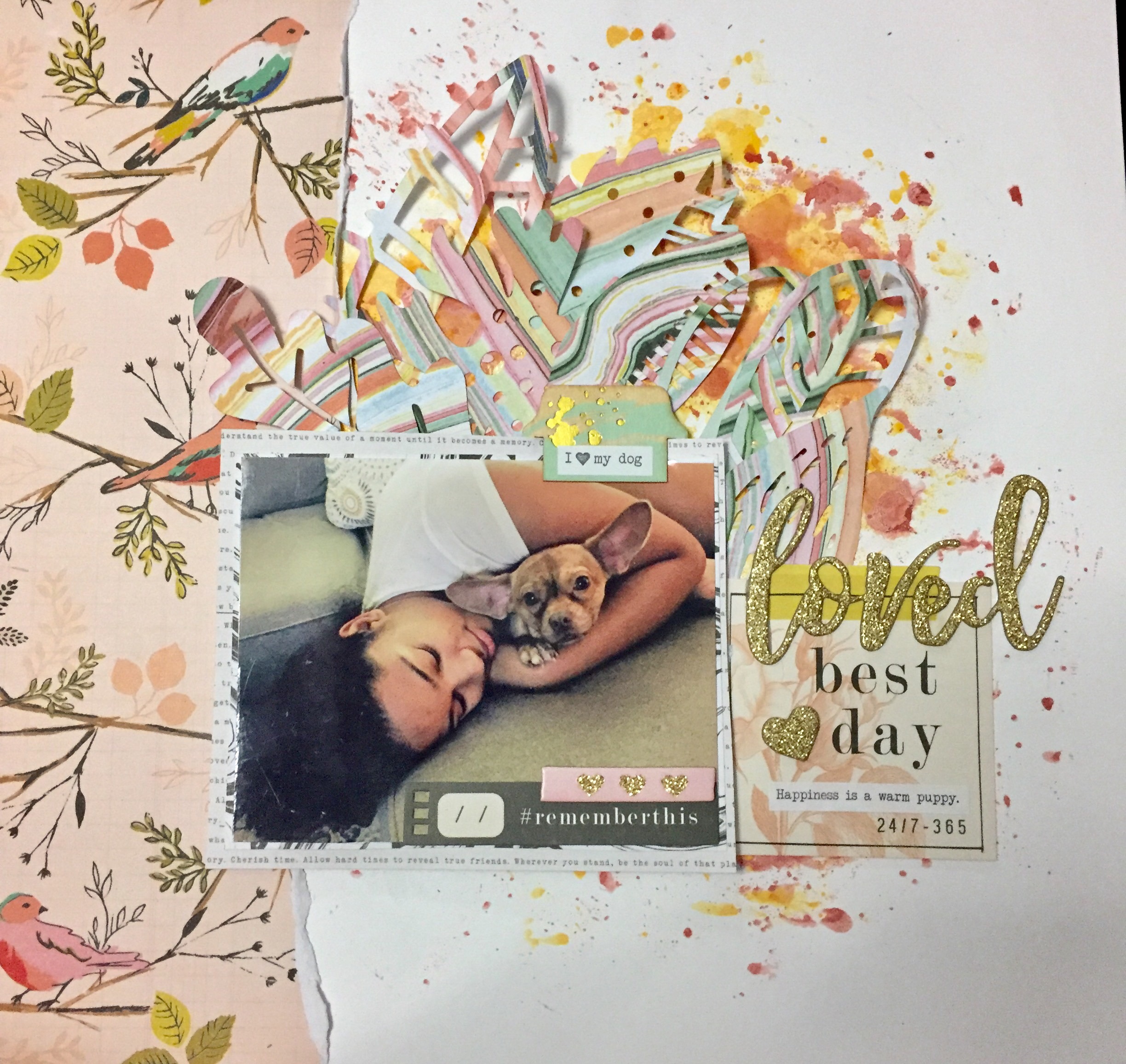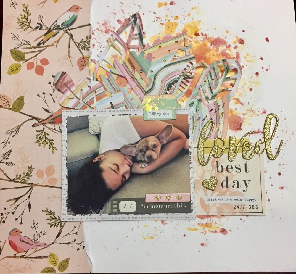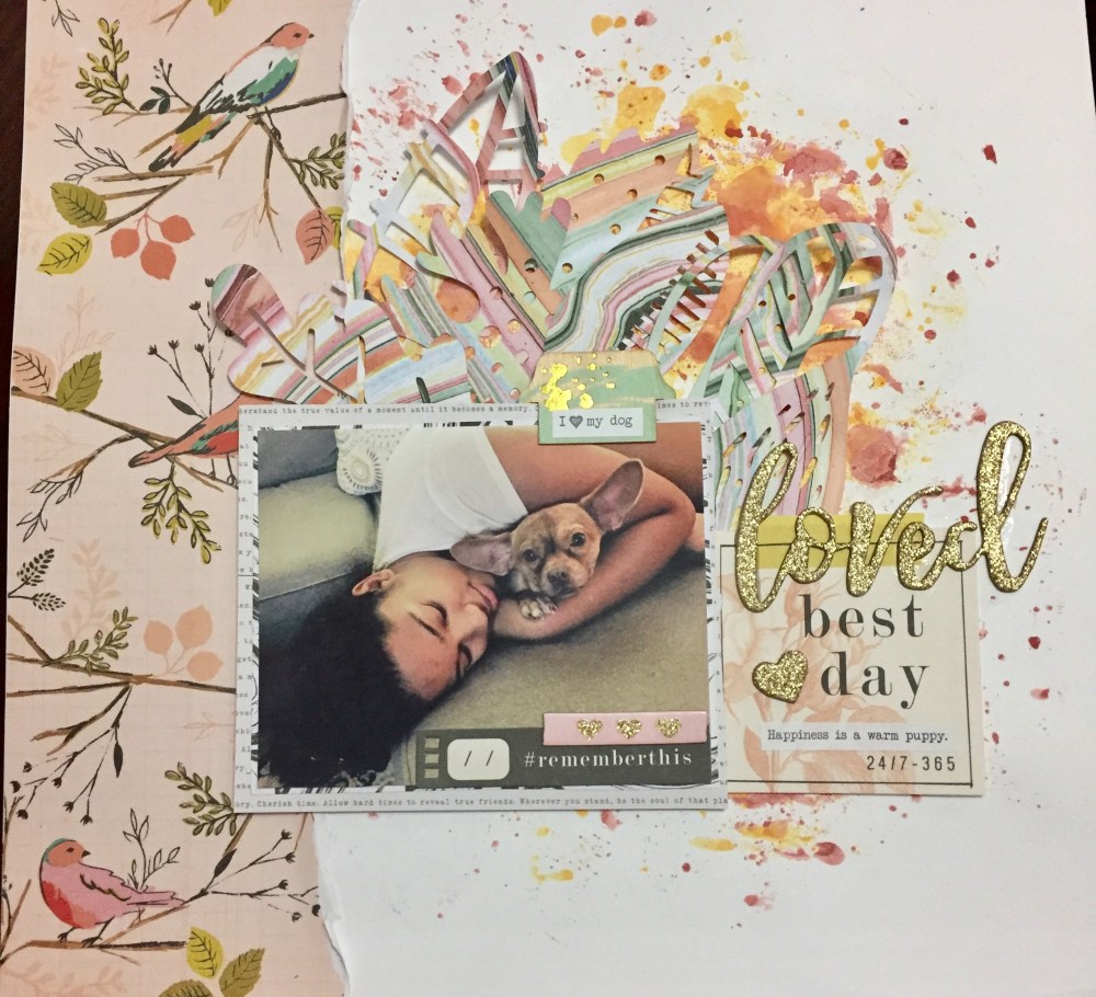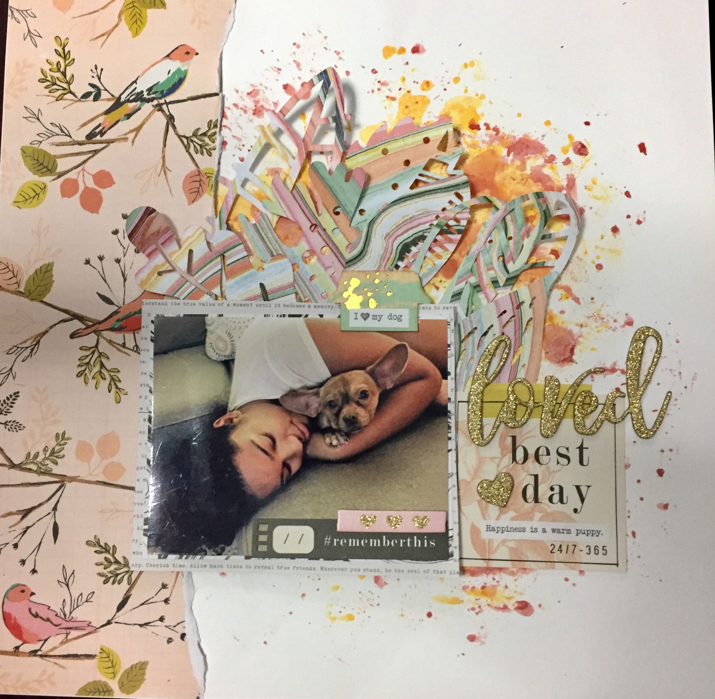 On the right of the photo,the tag that says “Best Day” is from one again Maggie Holmes die Cuts from the gather collection , I also added the “Loved” word from the American Crafts chipboard phrase stickers (maybe not the best title but I liked it at the moment) and another phrase from the studio calico phrase stickers (by the way how cute is that paper on the left with the birds and trees) ..