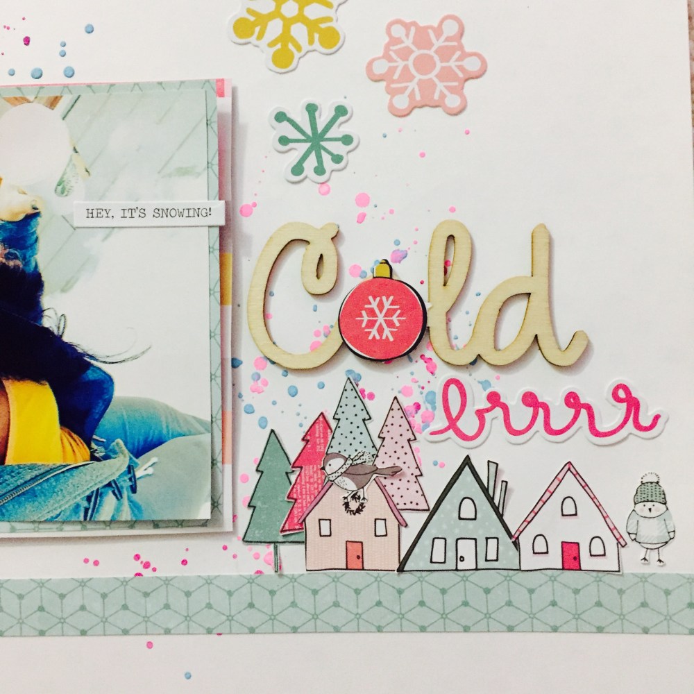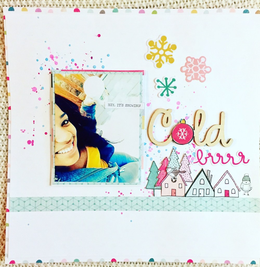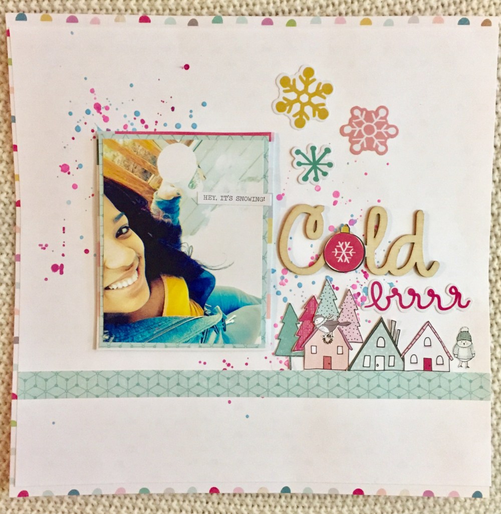 I started by splattering some watercolor- Like I always say, it’s super cheap from Michaels … …Then Layering my photo on cozy from the Snow and Cocoa collection by crate paper… I took some of the Exclusive die-cuts design by Kim Watson – the little snowflakes at the top right …