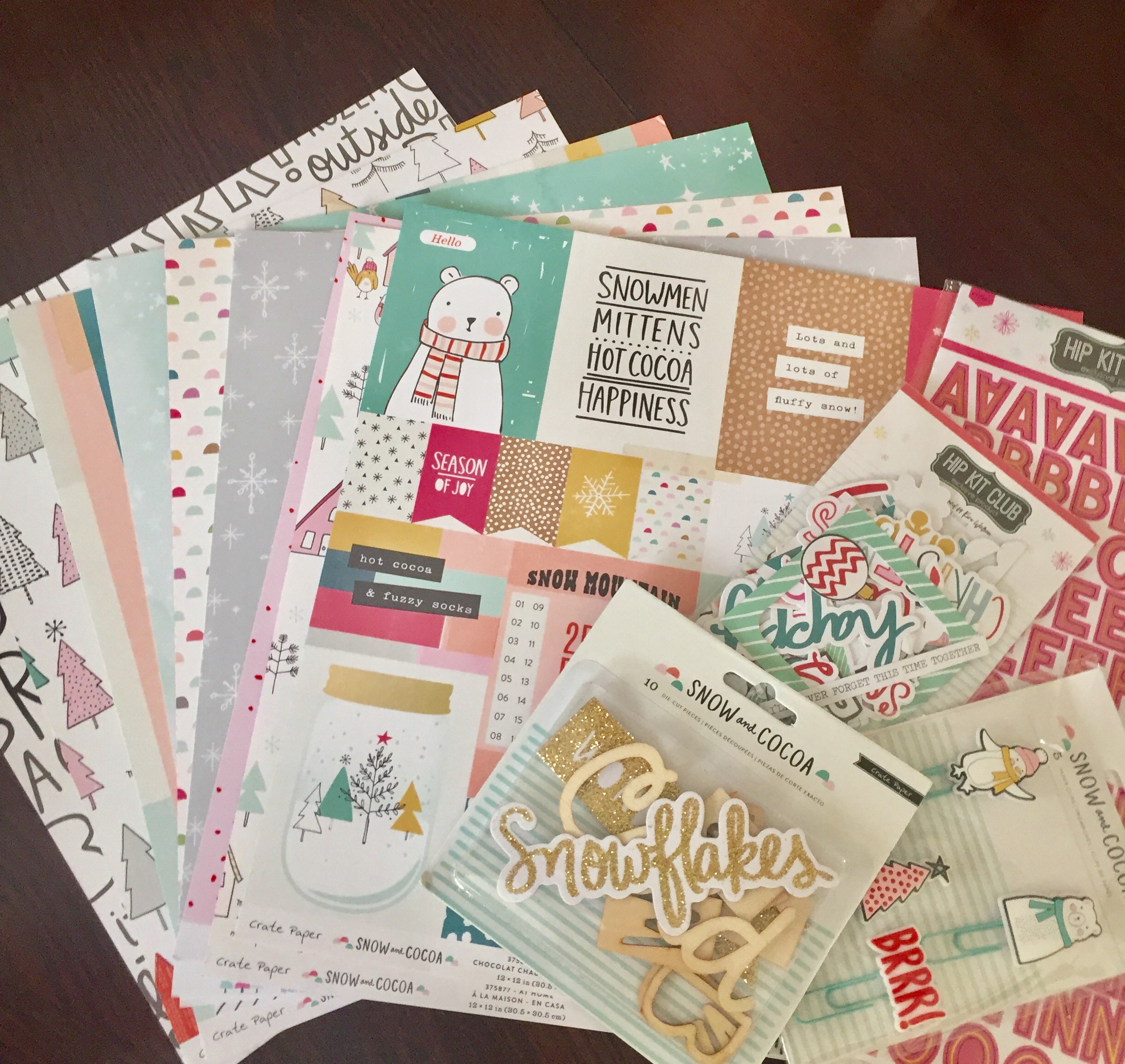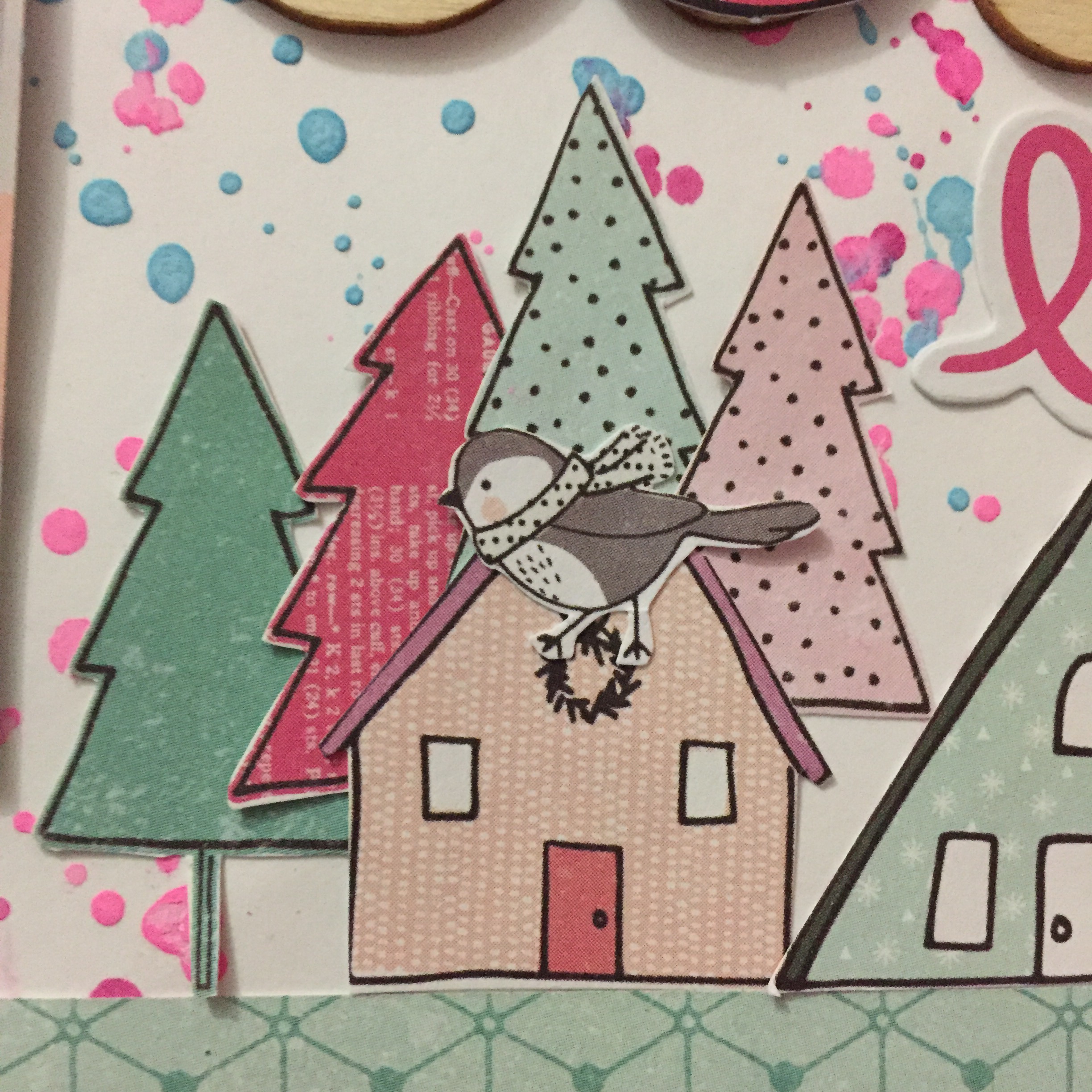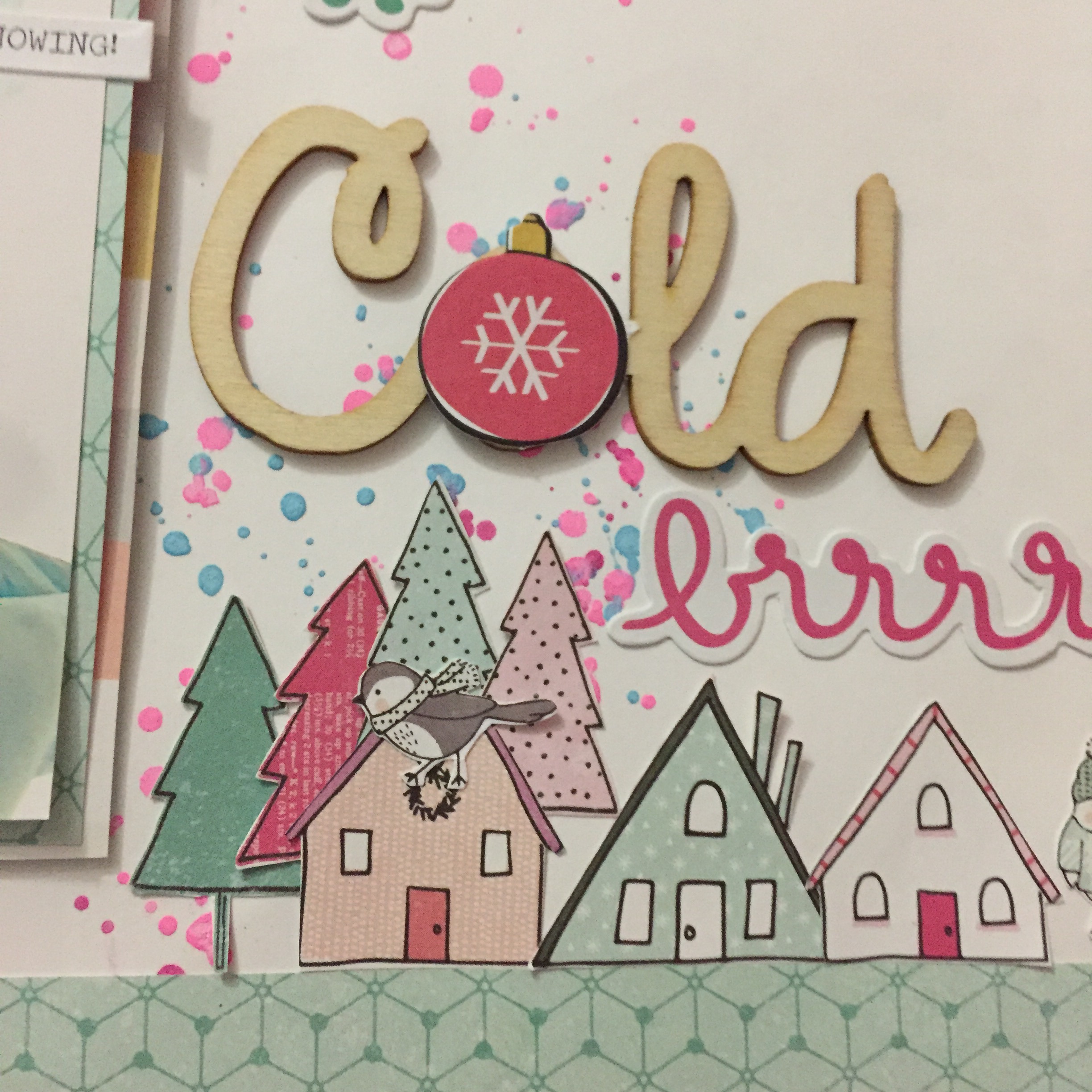 I started by splattering some watercolor- Like I always say, it’s super cheap from Michaels … …Then Layering my photo on cozy from the Snow and Cocoa collection by crate paper… I took some of the Exclusive die-cuts design by Kim Watson – the little snowflakes at the top right …