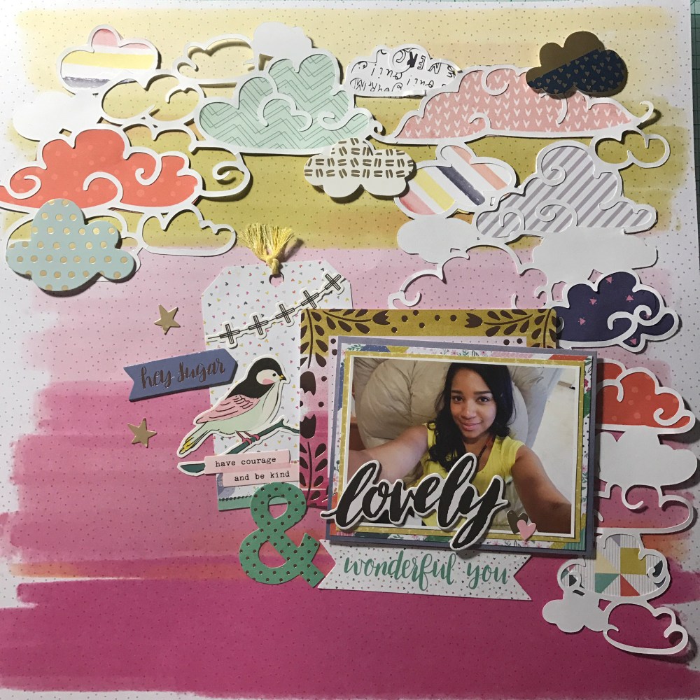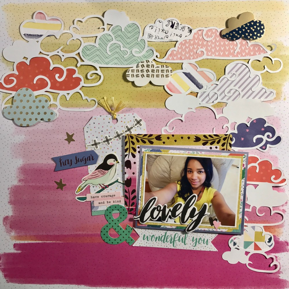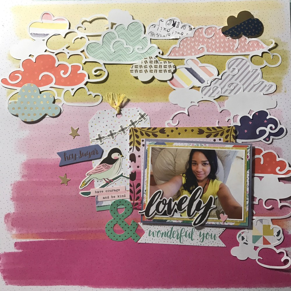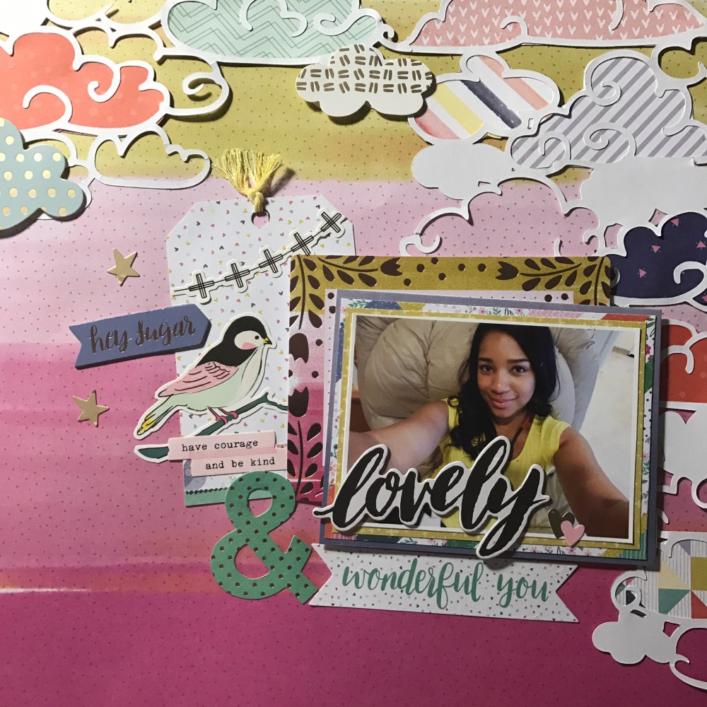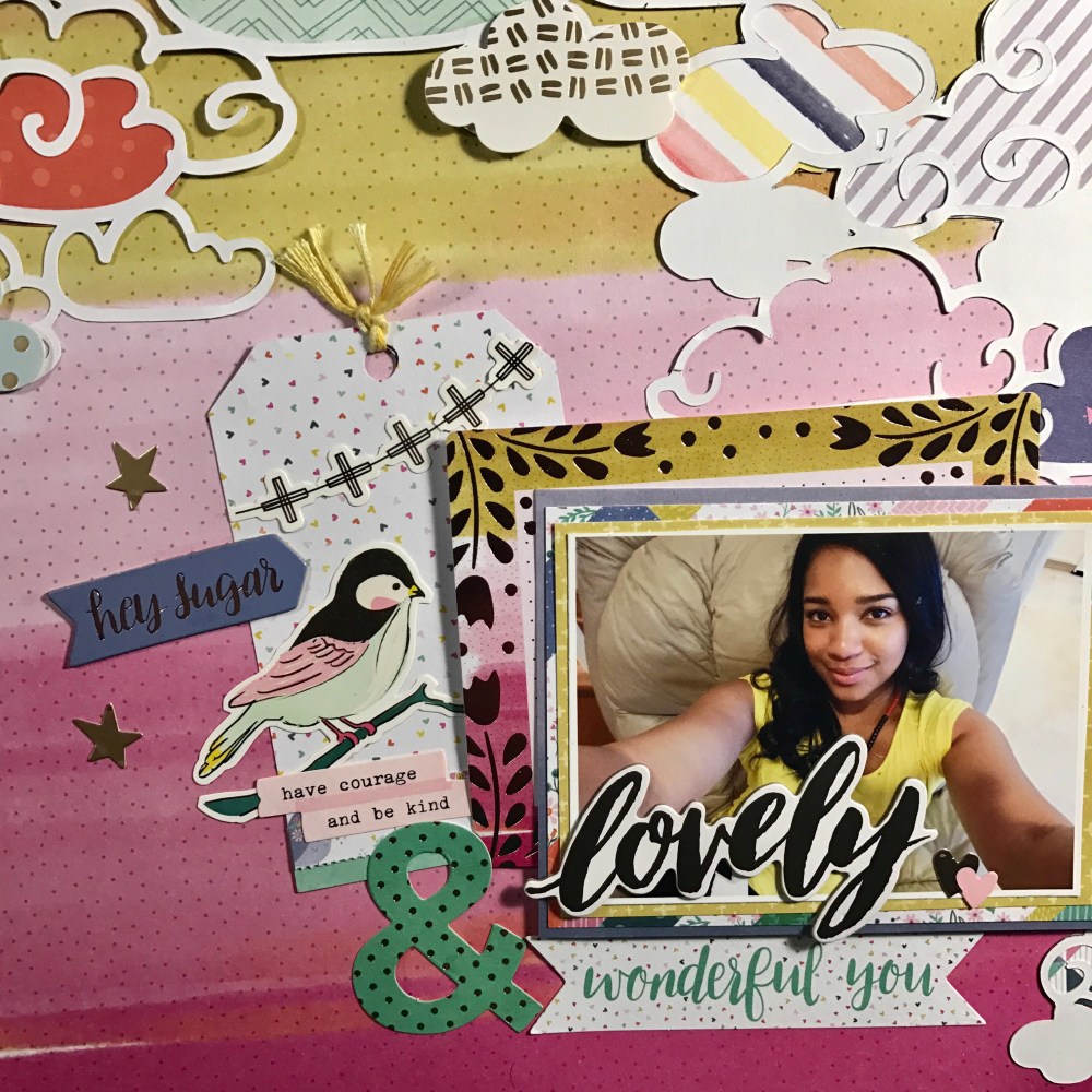I have so much color in this layout … It’s like a RAINBOW!!!! Like I have said before I love creating tags so here I started by creating a tag using two of my favorite collections. One from Maggie Holmes Chasing Dreams by Crate Paper and the other one from Paige Evans Oh my heart by Pink Paislee. Then I went to the Hip kit Club Page and downloaded a cut file from March downloads – clouds created by Kim Watson.