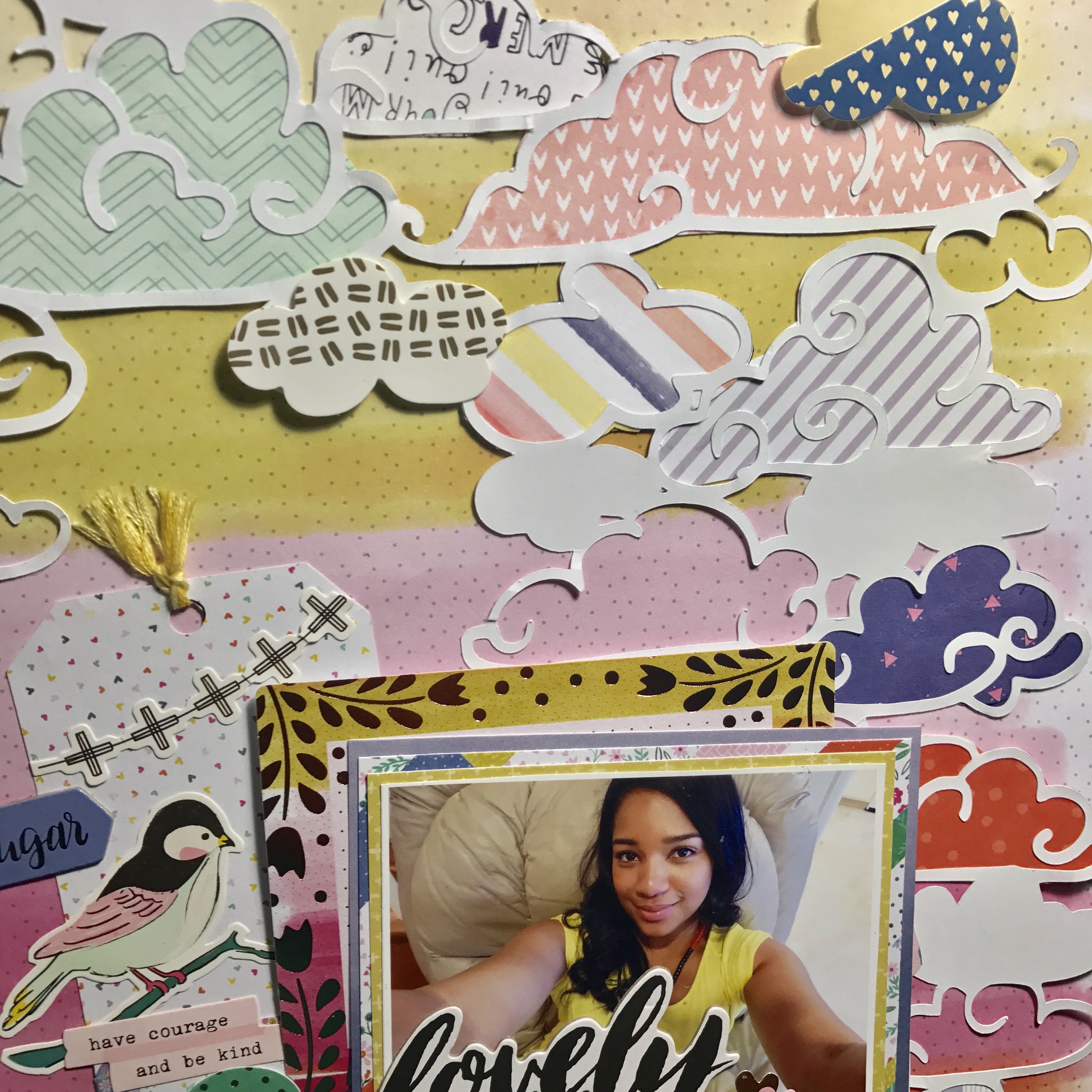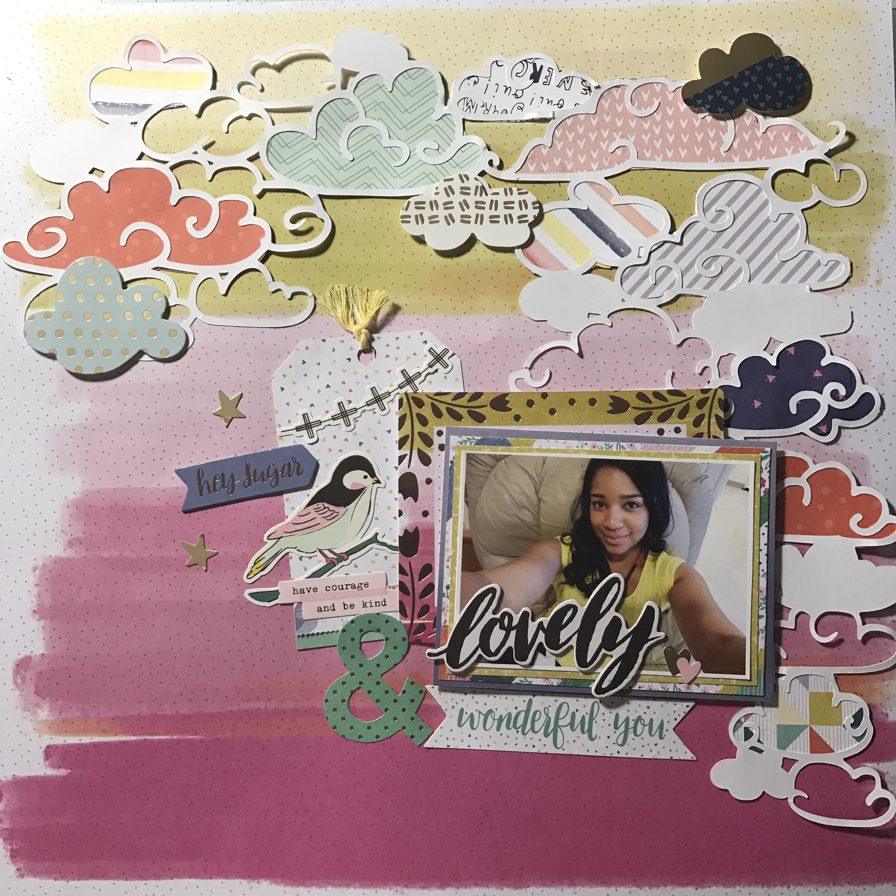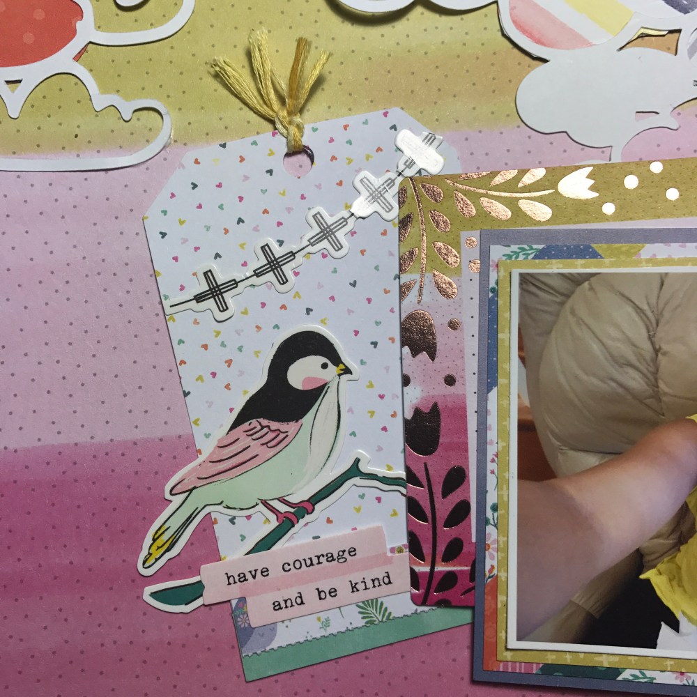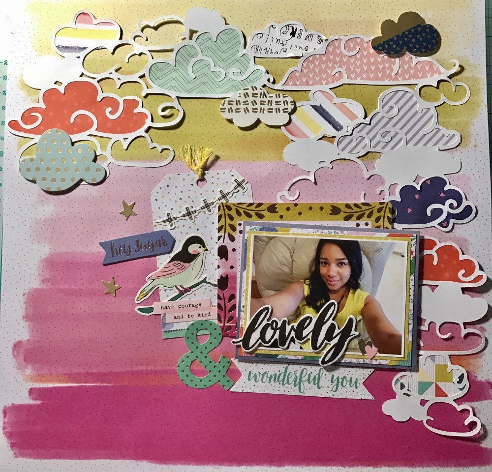 I have so much color in this layout … It’s like a RAINBOW!!!! Like I have said before I love creating tags so here I started by creating a tag using two of my favorite collections. One from Maggie Holmes Chasing Dreams by Crate Paper and the other one from Paige Evans Oh my heart by Pink Paislee. Then I went to the Hip kit Club Page and downloaded a cut file from March downloads – clouds created by Kim Watson.