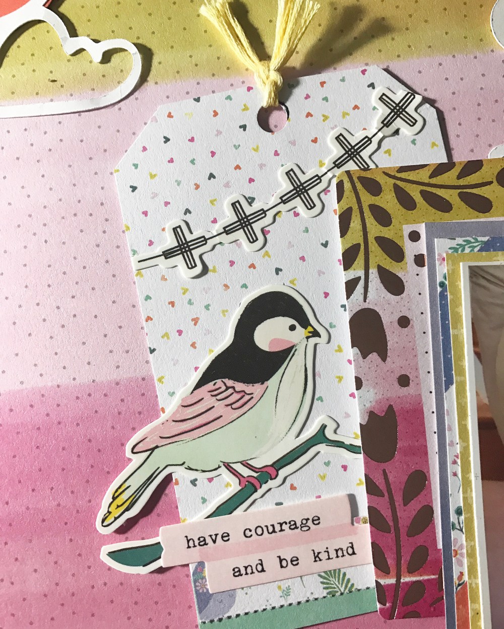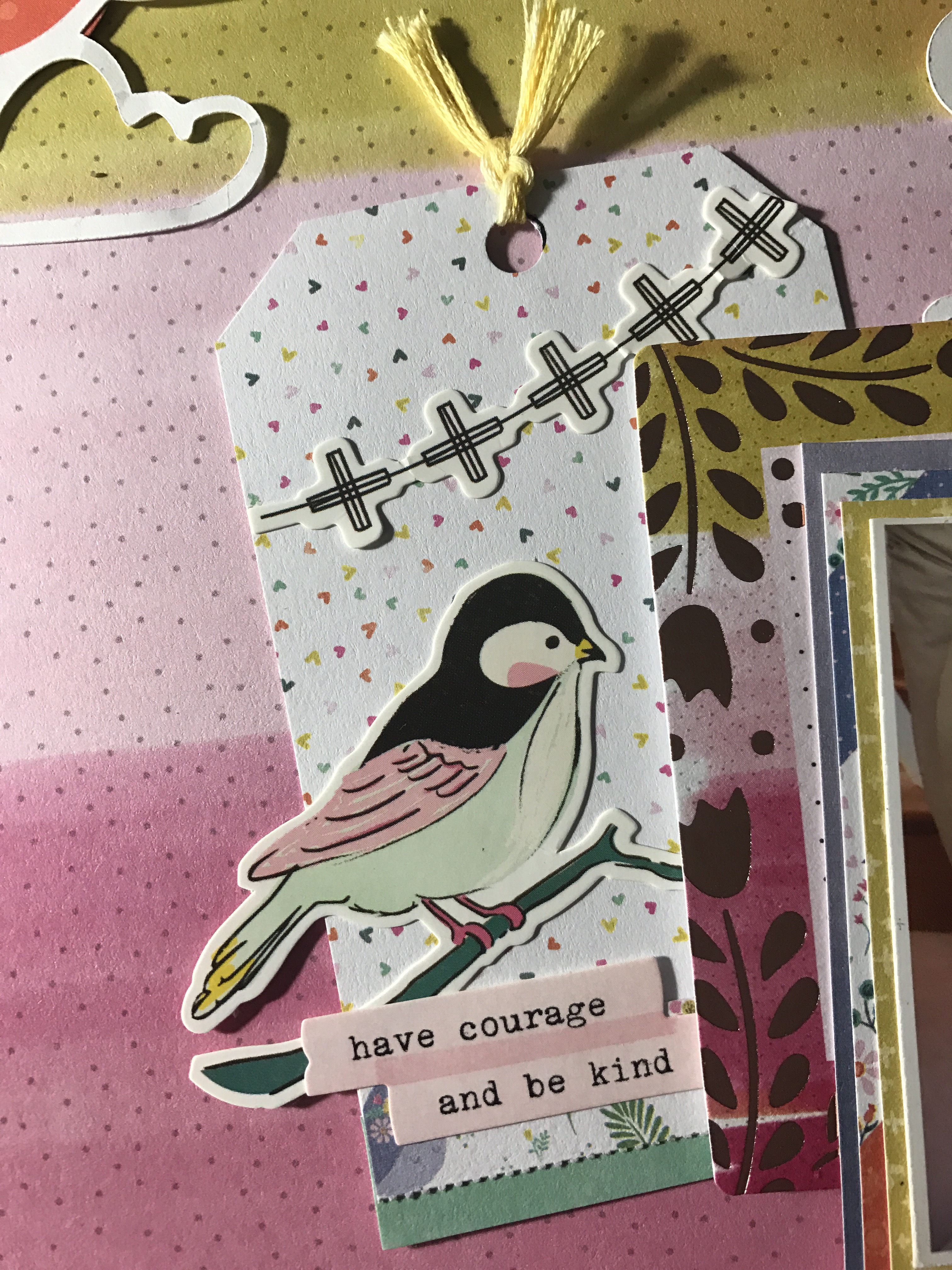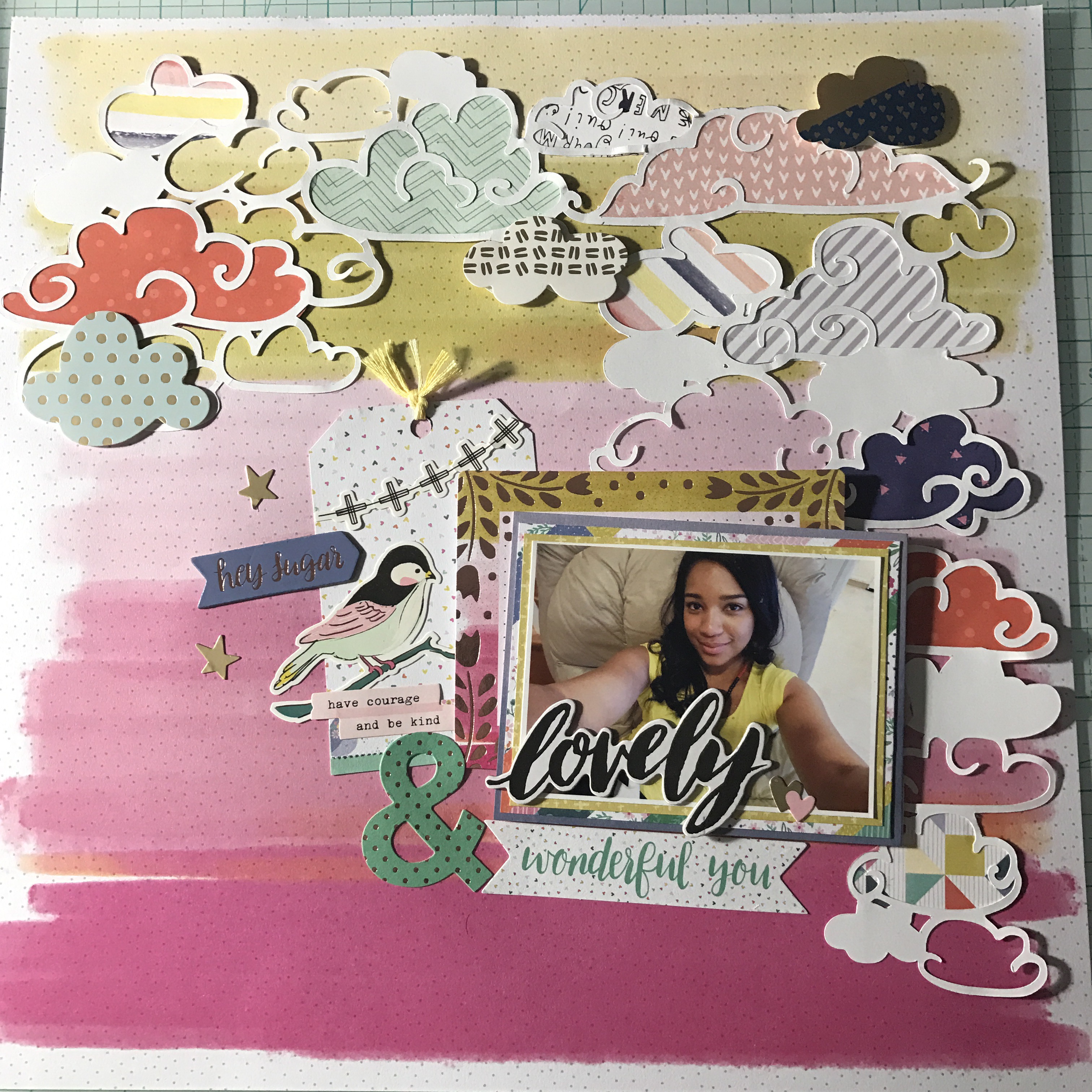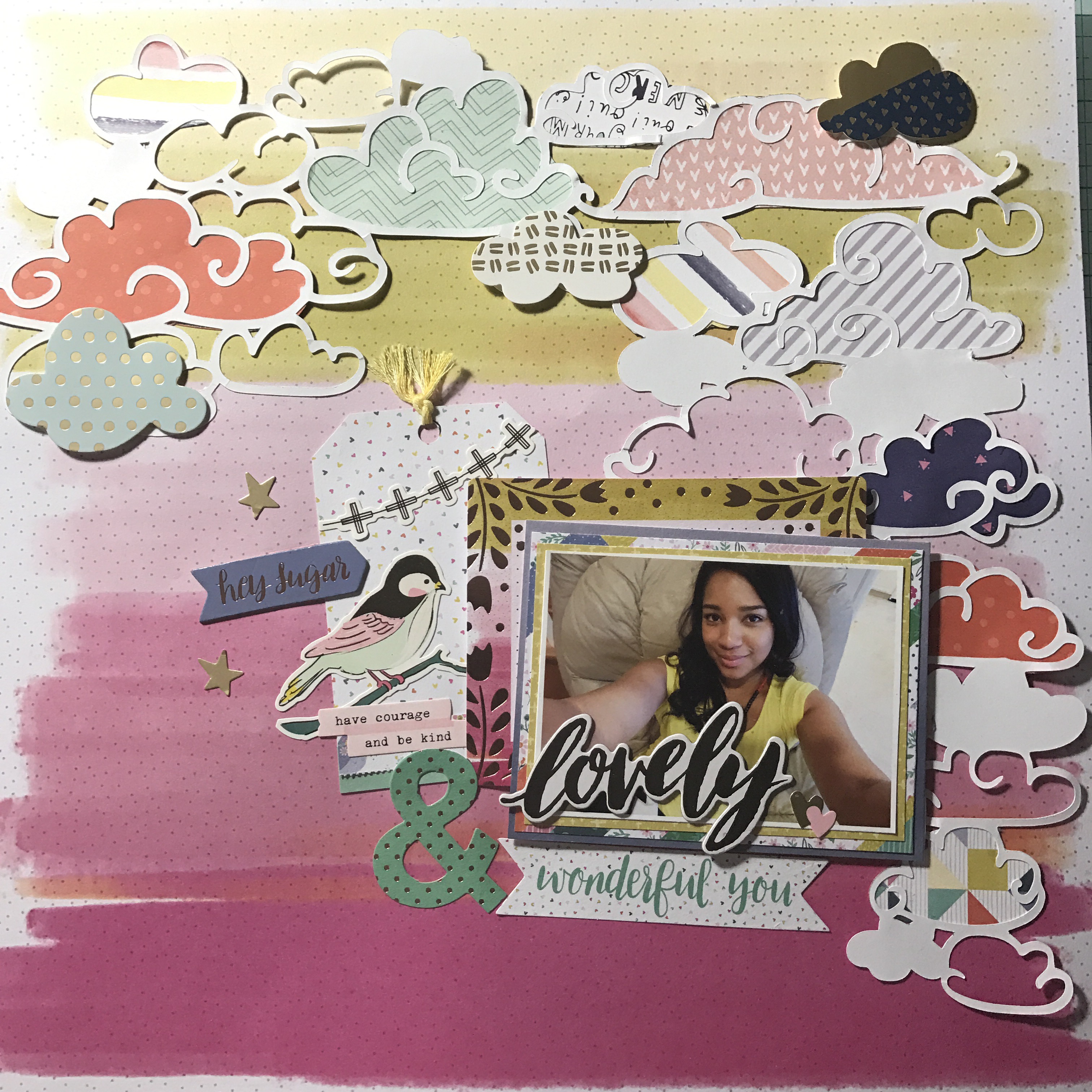 I have so much color in this layout … It’s like a RAINBOW!!!! Like I have said before I love creating tags so here I started by creating a tag using two of my favorite collections. One from Maggie Holmes Chasing Dreams by Crate Paper and the other one from Paige Evans Oh my heart by Pink Paislee. Then I went to the Hip kit Club Page and downloaded a cut file from March downloads – clouds created by Kim Watson.
