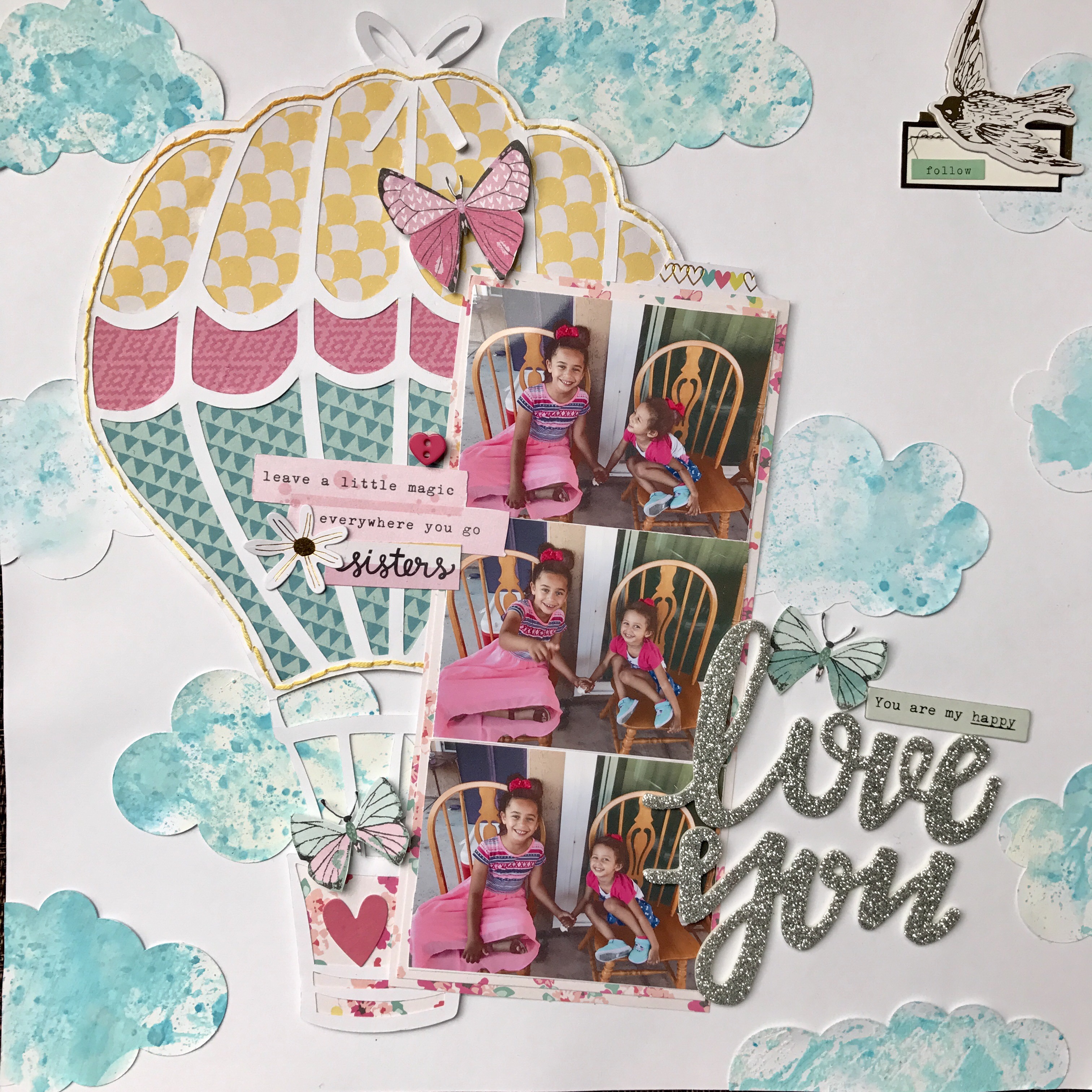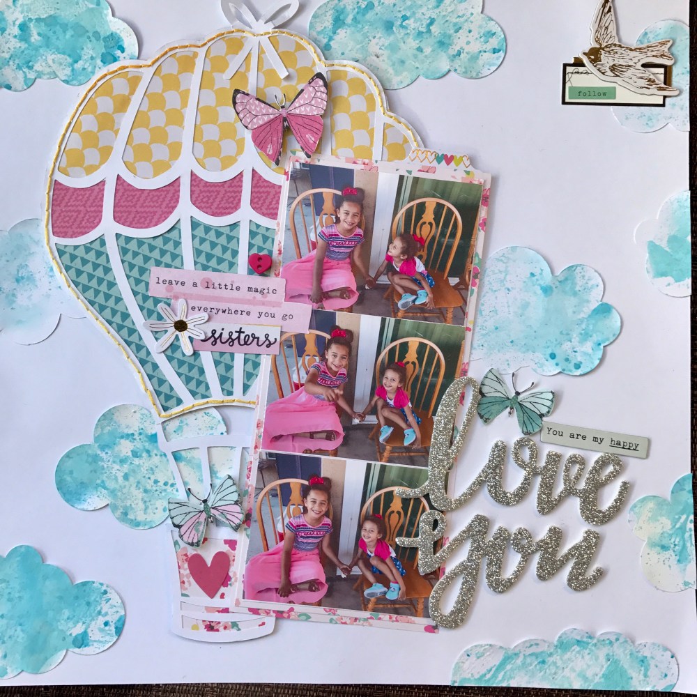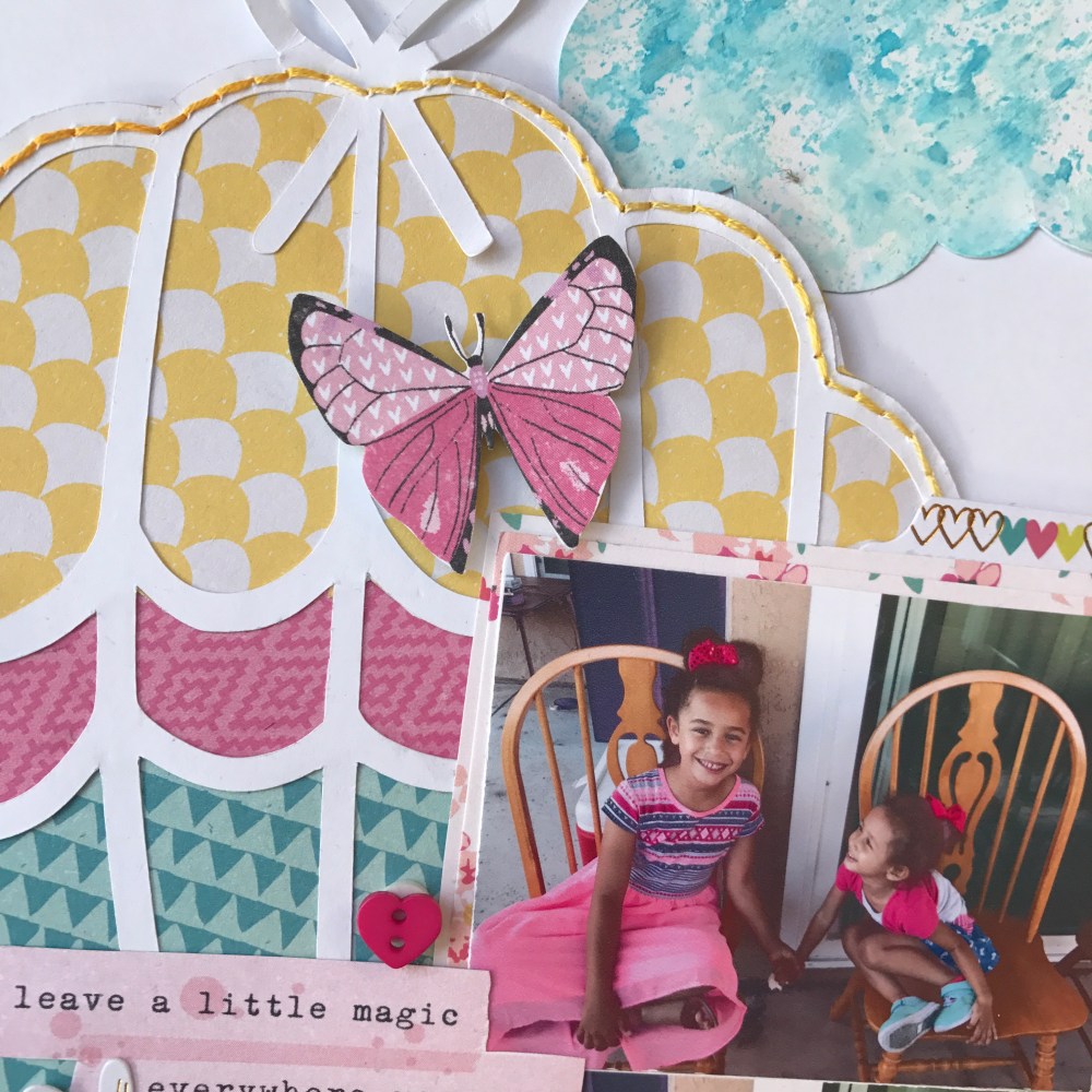 This was my first time trying stitching on a page, it took me a long time but it was worth it. I got the cut file from Hip Kit Club May, It was designed by Kim Watson and the clouds are from the Silhouette store, it’s called 9 clouds. I cut them with my Silhouette Cameo Machine and I did a little of mix media using Liquitex Basic – Gesso and Tim Holtz Distress Ink in Mermaid Lagoon.
