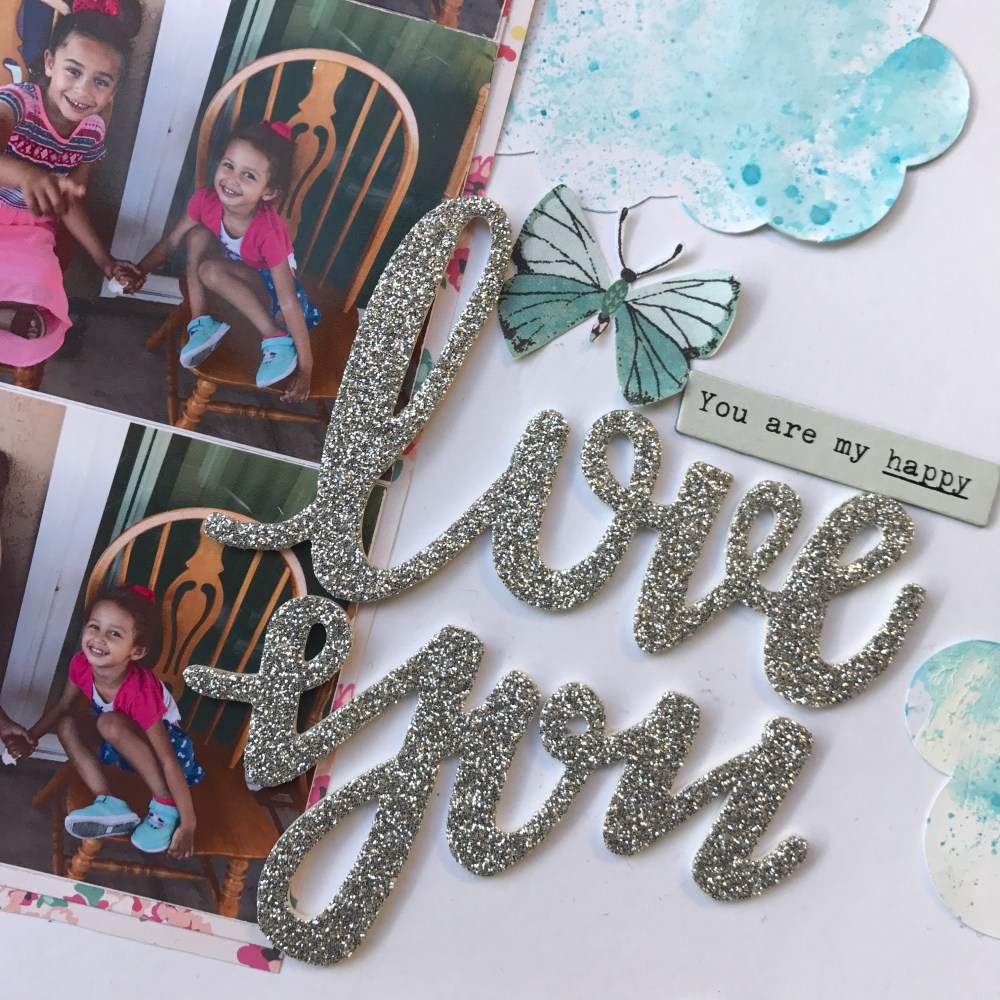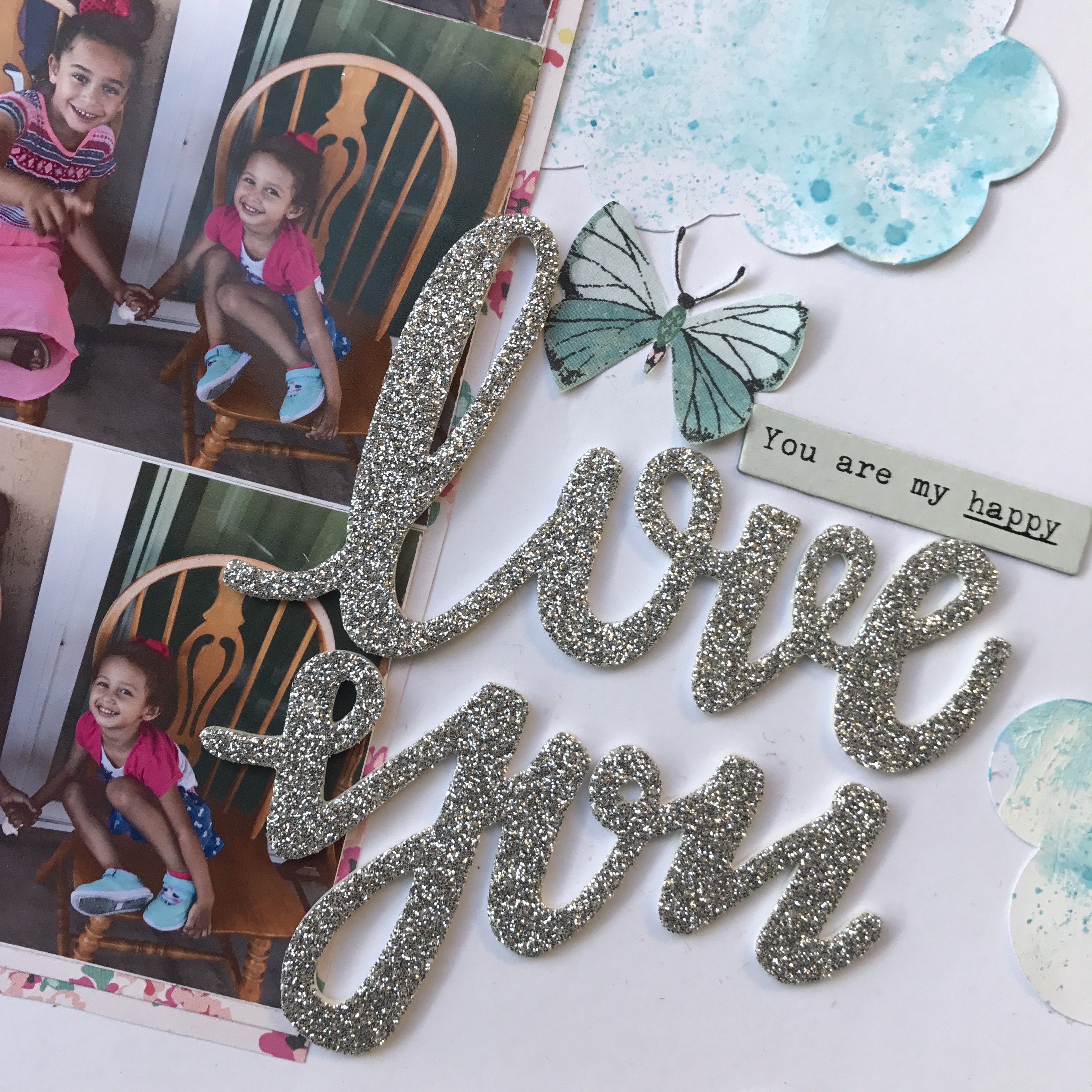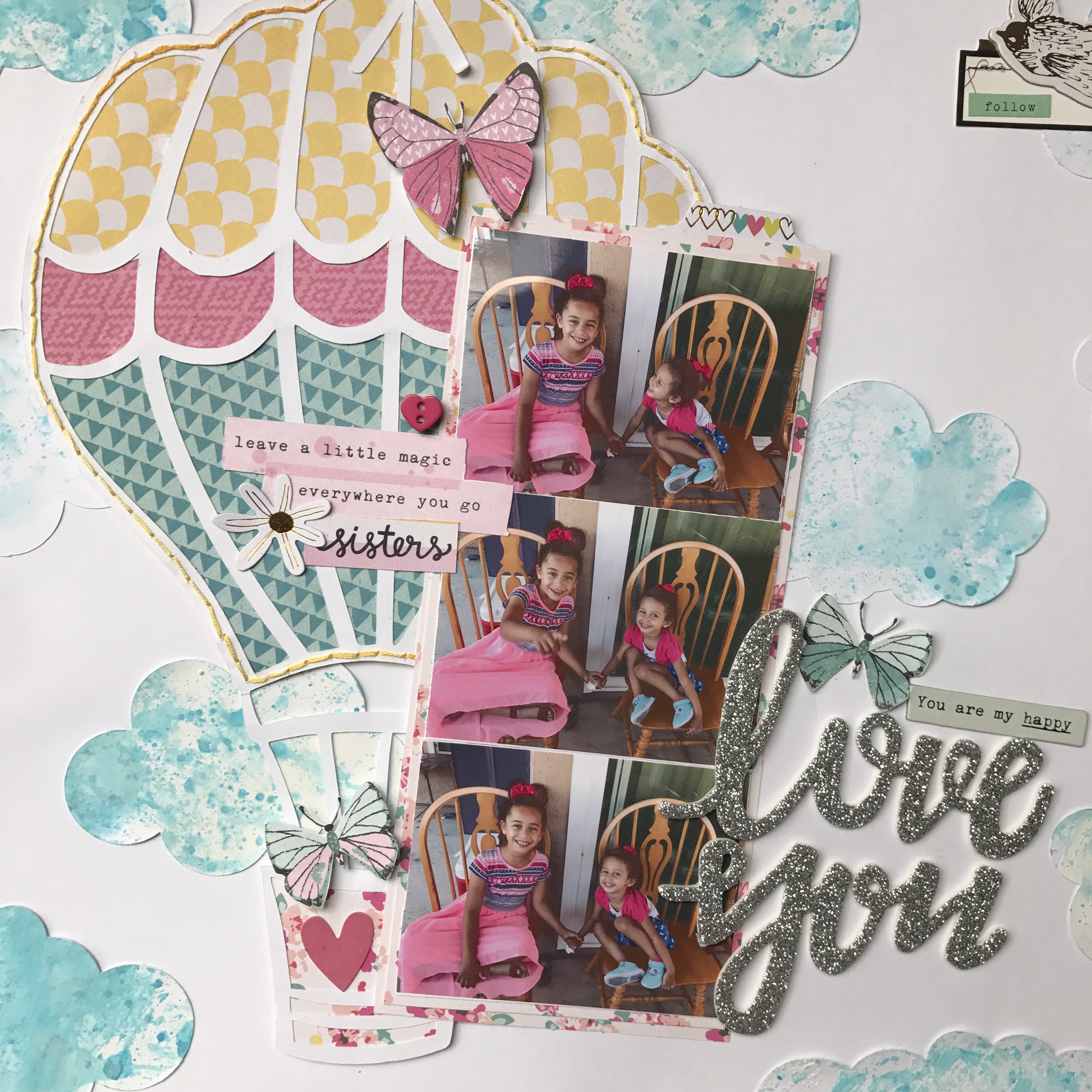 This was my first time trying stitching on a page, it took me a long time but it was worth it. I got the cut file from Hip Kit Club May, It was designed by Kim Watson and the clouds are from the Silhouette store, it’s called 9 clouds. I cut them with my Silhouette Cameo Machine and I did a little of mix media using Liquitex Basic – Gesso and Tim Holtz Distress Ink in Mermaid Lagoon.