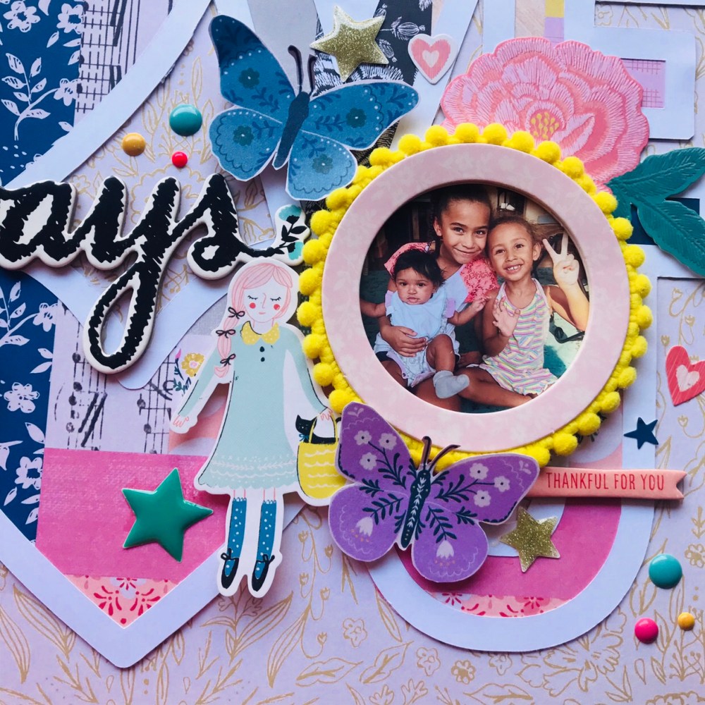 And for last it was time to add embellishments , I added chipboard , Card stock stickers and also fuzzy cut some butterflies from Flutter paper from the paper pad .