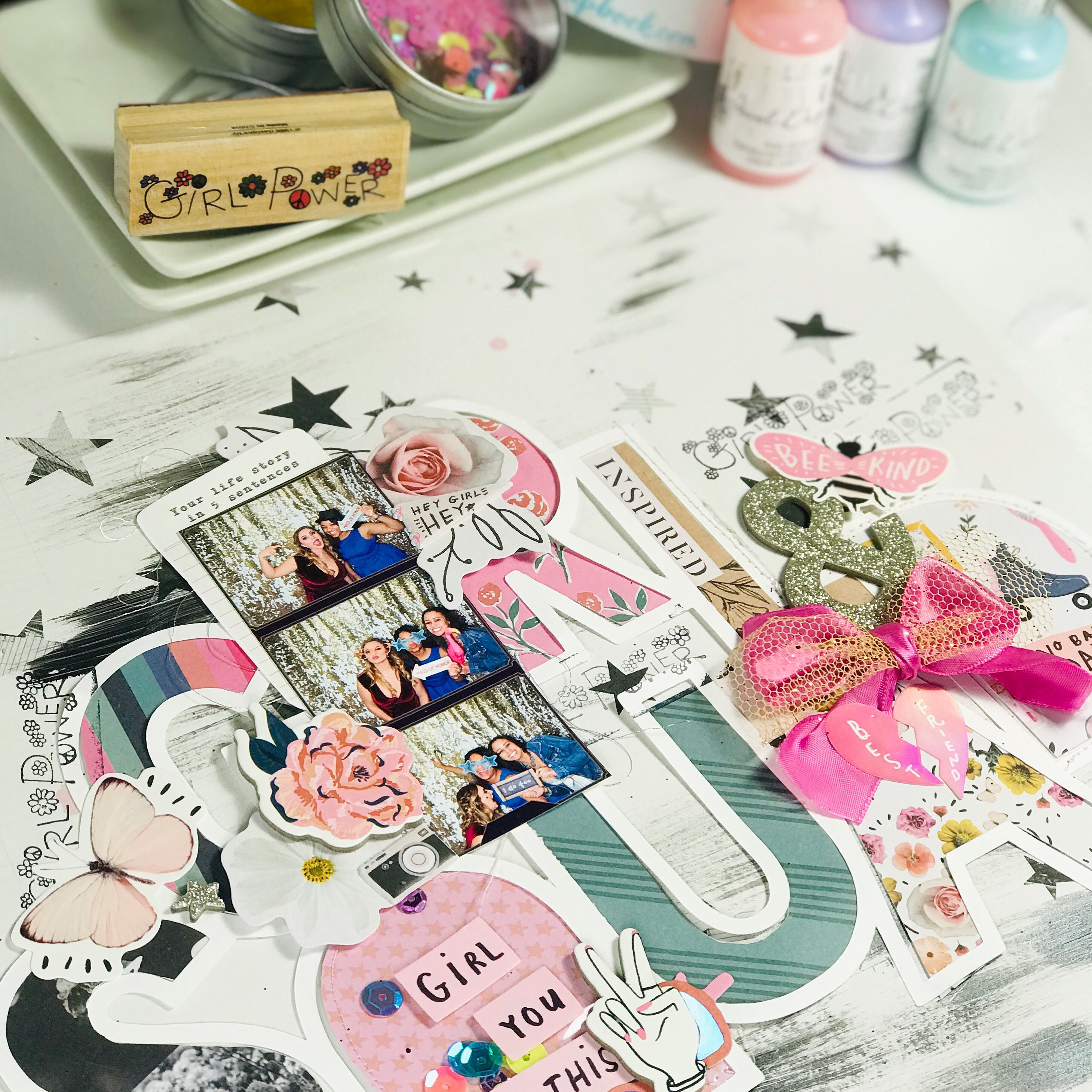 After, stamped girl power all over. I mean that stamp and this collection were meant for each other. added chipboard, stickers,I am even using a free printable that is available on the crate paper blog.