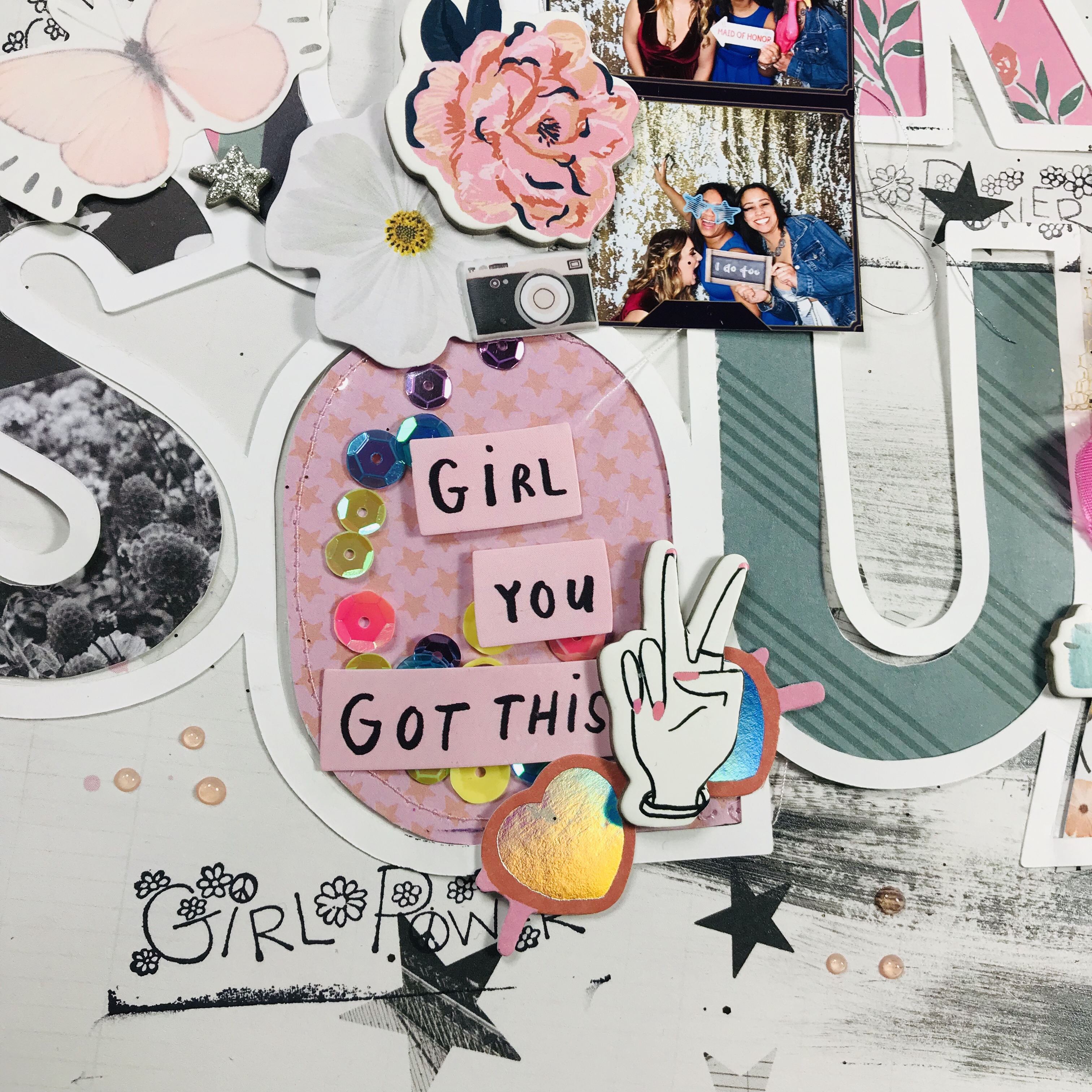 The first thing that I did was to cut my file with my Silhouette, of course! then, I decided to backup the letters with All Heart six by eight paper pad. I wanted something more playful in the layout, I mean its a girl squad after all. I wanted the layout to define unity, power,strong , support, love but also be playful. So, I created a little shakers using clear packaging from the Sticker sheet, I sew all around and left only a little opening to put the sequins in.