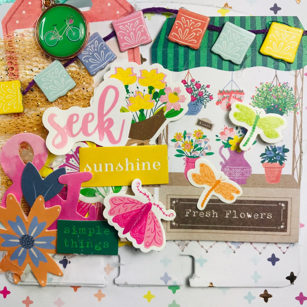 Now, it’s time to decorate the from of the card, I added a tag from the ephemera pack, on top of that I sew gold glitter tulle with my sewing machine. Added flowers to the side and that flower shop die cut from her ephemera too. In front of the flower shop, there I added three butterflies 🦋