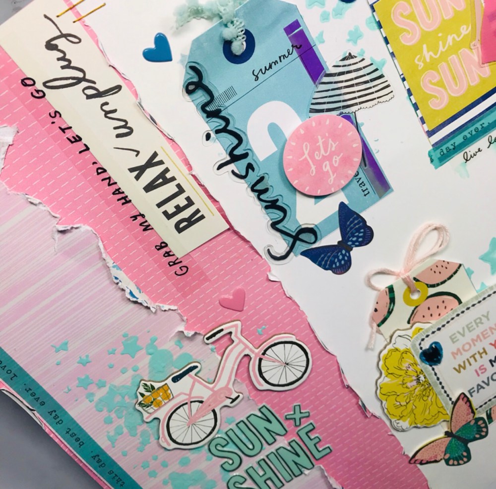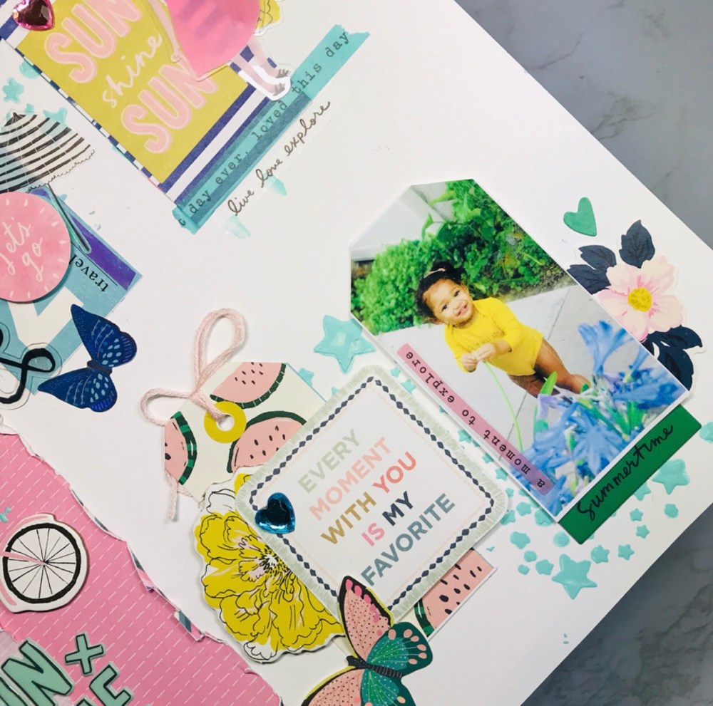 Added embellishments to the tags to create dimension with stickers, chipboard, string. On the left side of the Layout I layered two pink papers , if you look closely, they both have lines and I used my scissors to distress the edges . Created a title using the Ephemera pack and the chipboard stickers.