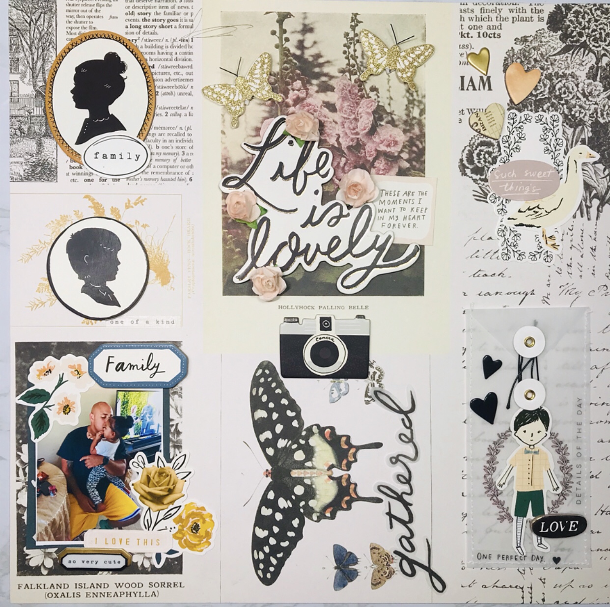 For the middle bottom, the page already had a butterflies,I added the word gathered and chipboard camera from the chipboard stickers for a little dimension.