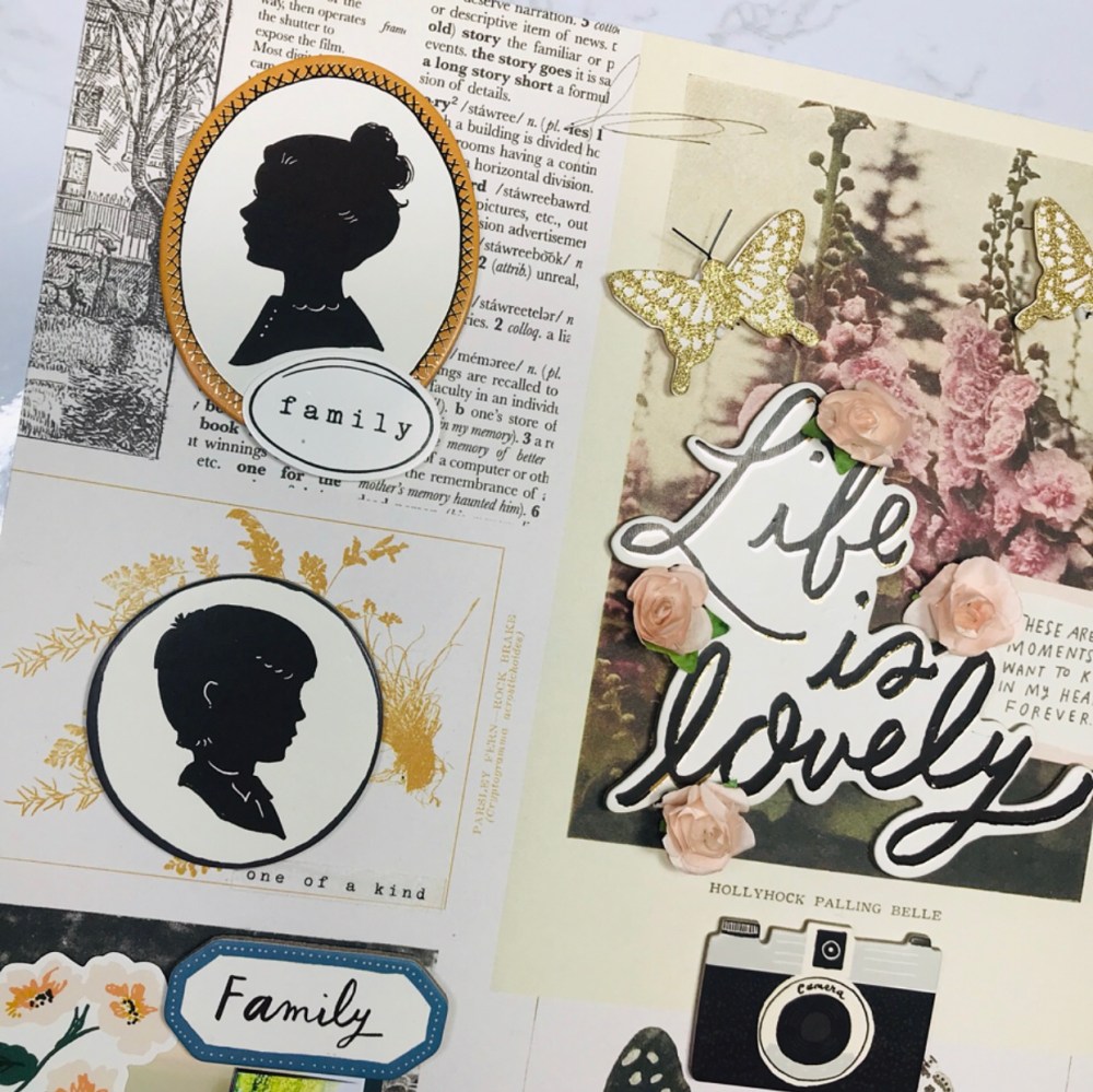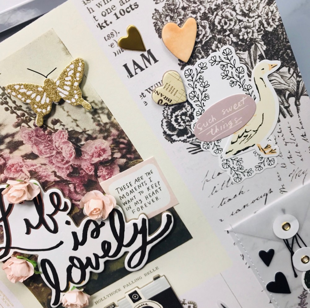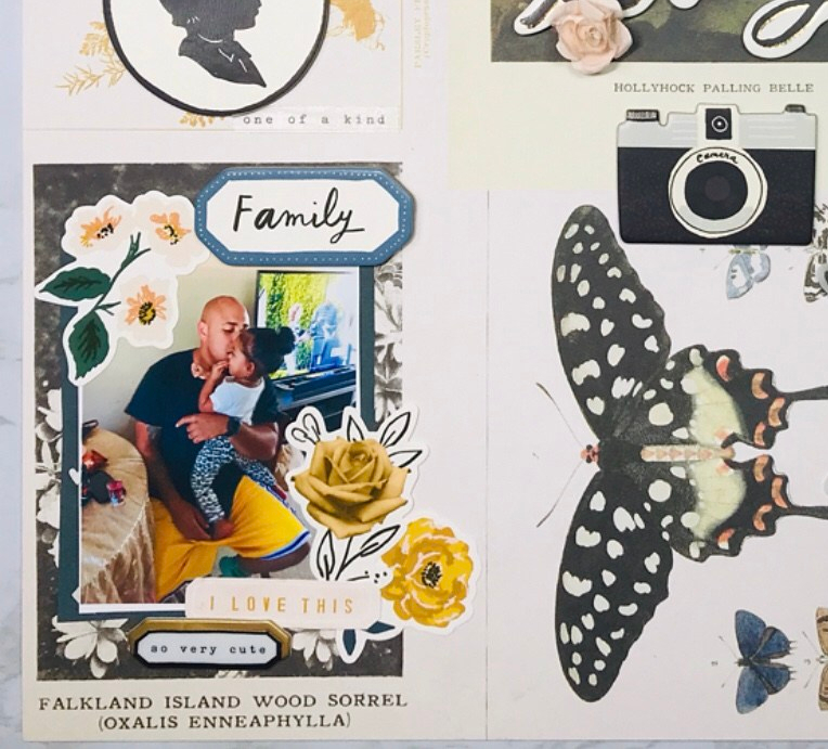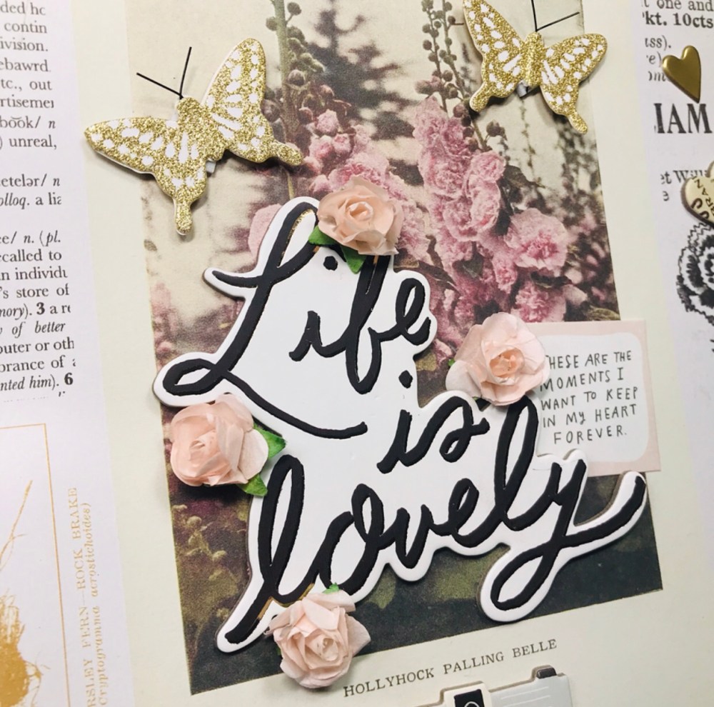 I started by flipping through all the 12 by 12 papers that I have and decided to use the keepsake paper. It’s a very busy paper but I wanted some of the elements to stand out even more . I used LIFE is lovely for my title – chipboard stickers . Easy name, already ready for me to use, haha! Around my title I added paper flowers , butterflies with gold glitter And the phrase ‘These are the moments I want to keep in my heart forever’ from the ephemera pack. Little details that spoke to me because of the photo.