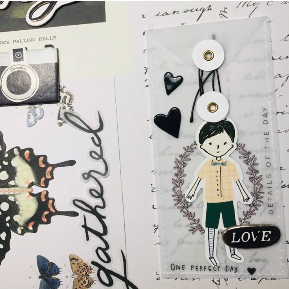 The last rectangle of the 12 by 12 page I added one of the velum envelopes from the cards and envelopes stationary pack and embellished with more card stickers . That is were I am going to be doing my private writing for Savanna to read in the future, when she is flipping through the pages of the family albums.