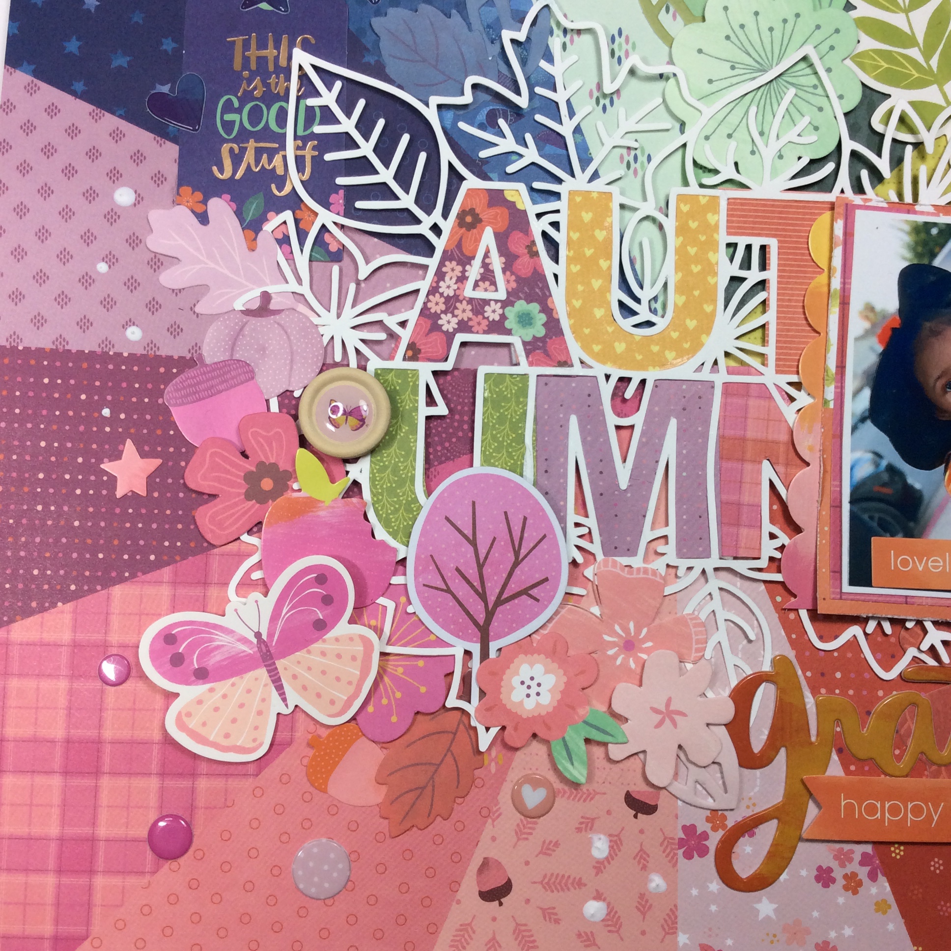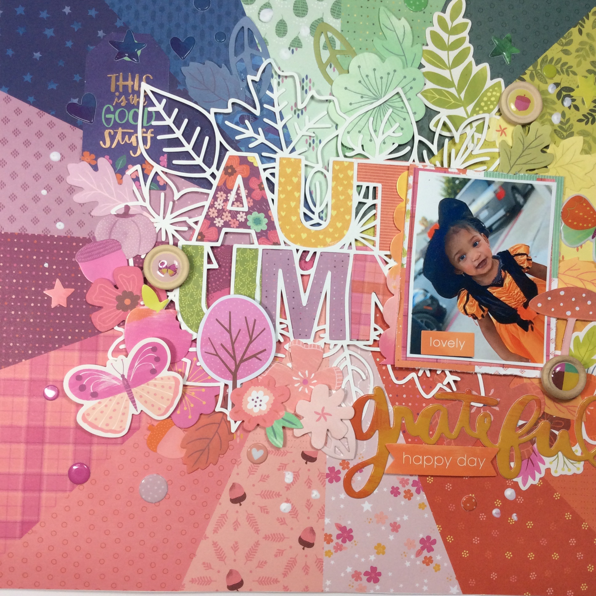 Feeling the warm colors from the Truly Grateful collection! Cut file and collection is by Paige Evans for Pink Paislee . This is one of my favorite papers in this collection. Love love love the rainbow. I added embellishments from the same collection.