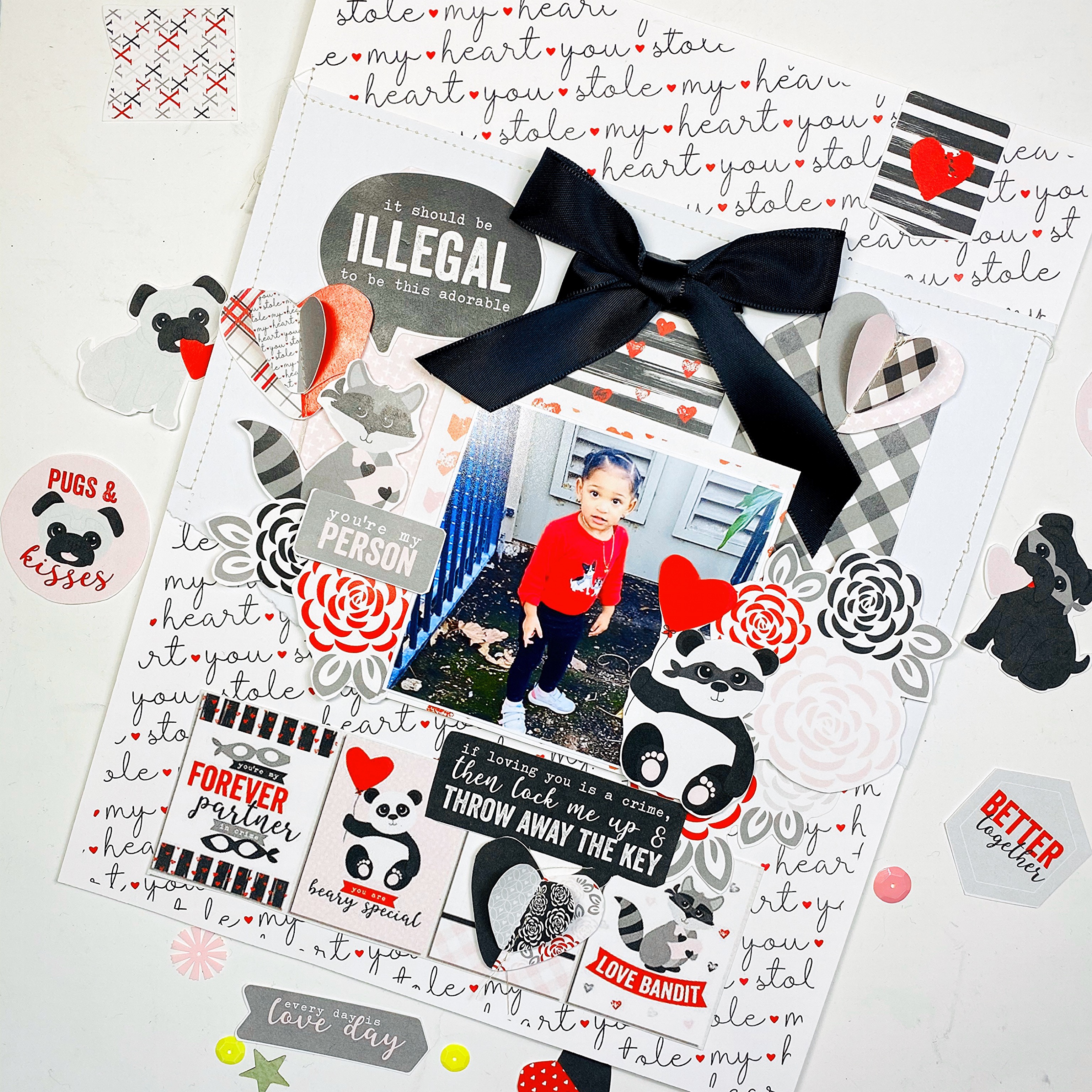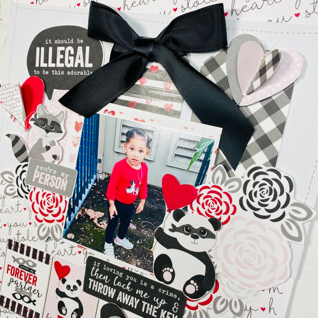 For the background I used the You stole my heart paper and I ripped white card stock and stitched it in the center of the page. I wanted my photo and embellishments to stand out but also be able to have the background on the bottom and top. Another idea could have been velum .