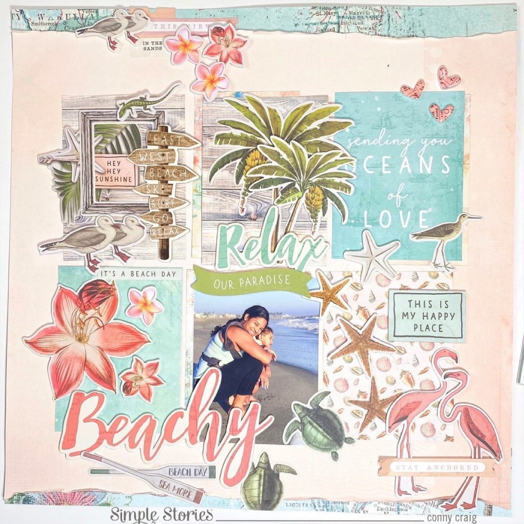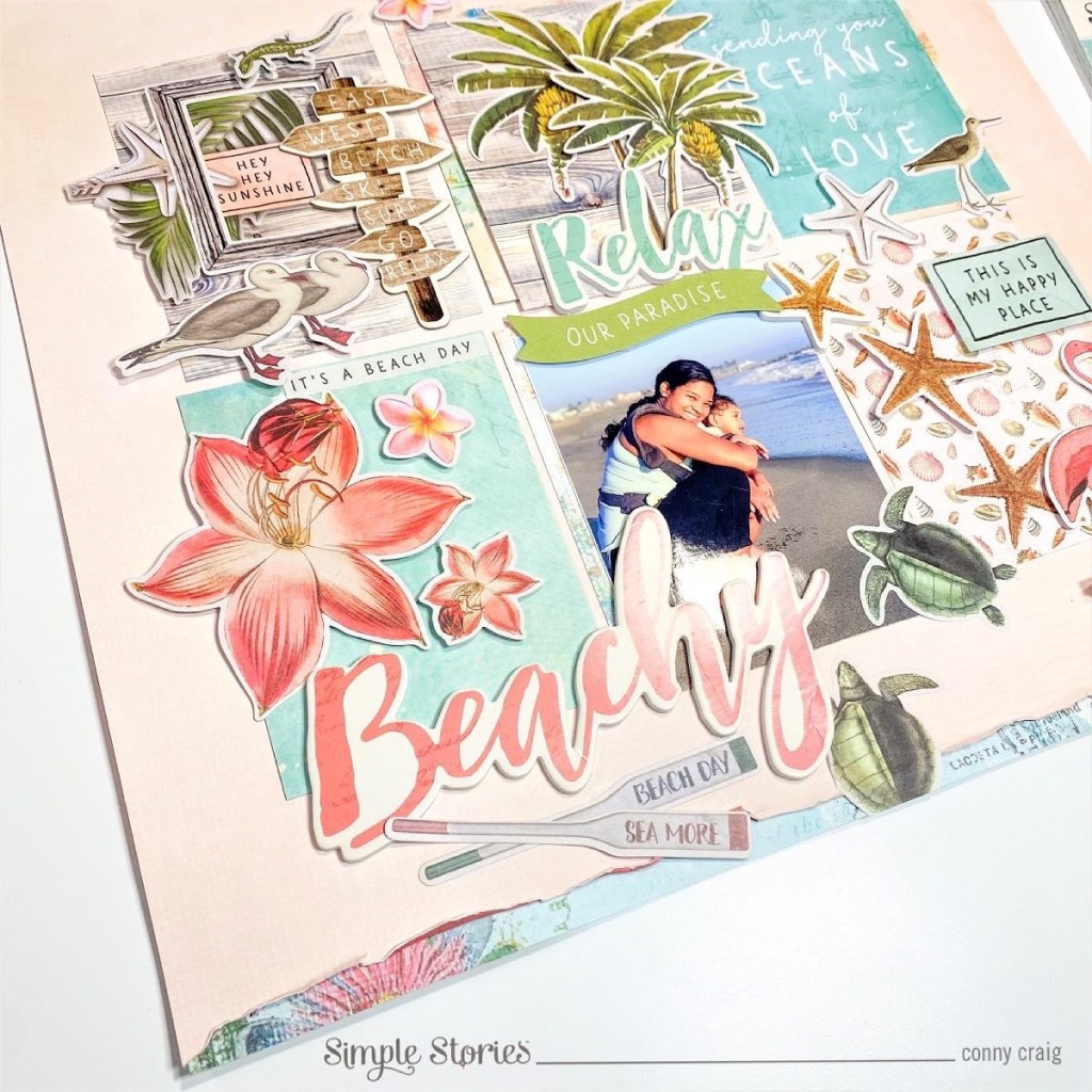 My title is Relax, our beachy paradise. I ripped/distressed the top and the bottom on the layout-I wanted it to look like waves of water coming into the sand, just like when we are at the beach.