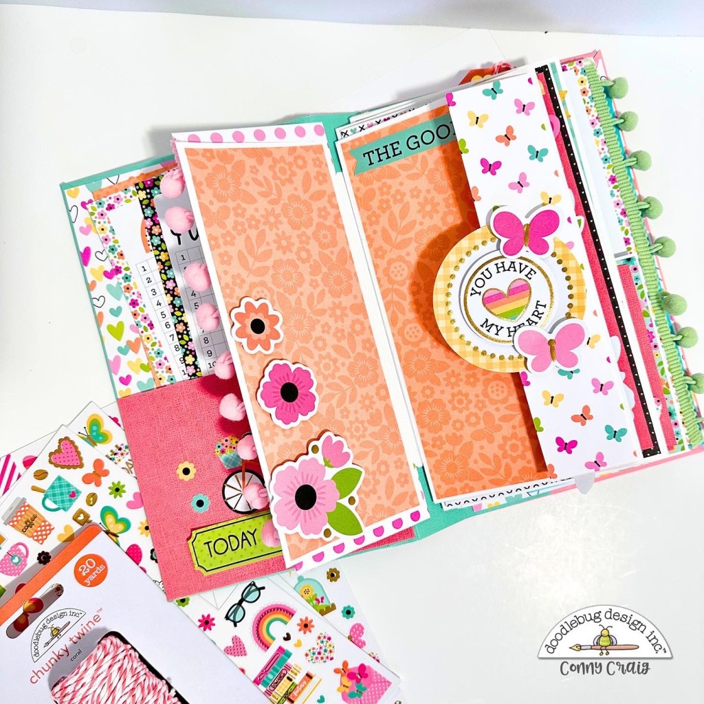 Then, doodle-pops cardstock stickers in fancy flutters & added gold sprinkles. For the pages, I used the 12” by 12”, 6” by 6” patterned paper, and 12” by 12” solid textured cardstock to create pockets, pages, flip pages, and embellished with cardstock stickers and bits & pieces from the collection, I even created a cute tassel with the doddle twine in the color coral! Thank you once again for stopping by and we can’t wait to see what you create with Hello Again! Love Conny!